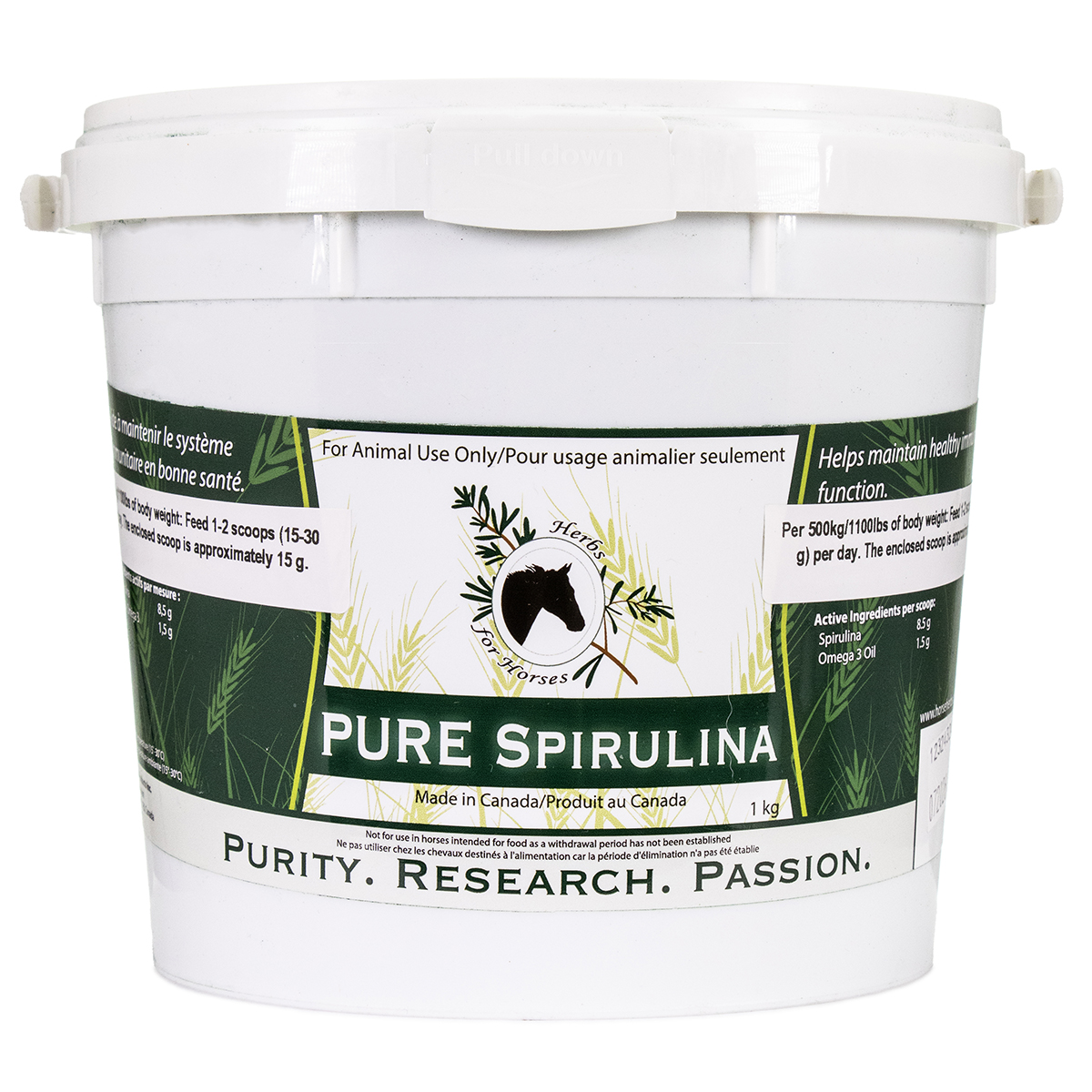 A “Superfood” containing amino acids and plenty of trace elements to assist in the proper function of the equine body. ISO certified. Spirulina has been known to boost the immune system. MAIN BENEFITS: Immuno-stimulating. Protein-building. No fillers. Prepared free of toxins, heavy metals, pesticides. INGREDIENTS: 100% Pure Blue Green Algae (Spirulina), Omega-3 Oil (to control dust) Composition: Protein 65 - 70 % Phycocyanin 8 - 12 % Carbohydrates 15 - 16% Fats 5 - 6% Vitamins: Vitamin A 105 - 130 mg/100g Vitamin B1 2.70 mg/100g Vitamin B2 3.40 mg/100g Vitamin B3 86.50 mg/100g Vitamin B6 0.54 mg/100g Vitamin B12 0.052 mg/100g Vitamin E 5 - 10 mg/100g Amino Acids: Alanine 2.70 g/100g Arginine 2.60 g/100g Aspartic Acid 4.10 g/100g Glutamic Acid 4.50 g/100g Glycine 2.30 g/100g Histidine 4.80 g/100g Isoleucine 4.00 g/100g Leucine 4.10 g/100g Methionine 4.65 g/100g Phenyl Alanine 5.14 g/100g Serine 3.27 g/100g Threonine 3.71 g/100g Tyrosine 5.64 g/100g Valine 3.65 g/100g Minerals: Calcium 20 mg/100g Phosphorus 510 mg/100g Magnesium 78.5 - 96 mg/100g Iron 20-60 mg/100g Potassium 110-390 mg/100g Selenium (organic) 0.0057 mg/100g Fatty Acids: Gamma Linolenic Acid: 810 mg/100g Phytopigments: Carotenoids 0.4 % min. Chlorophyll 800-1600 mg/100g DAILY FEED RATE (per 500 kg / 1100 lbs of body weight): Feed 1-2 scoops (15-30 g) per day. Enclosed scoop is approximately 15 g