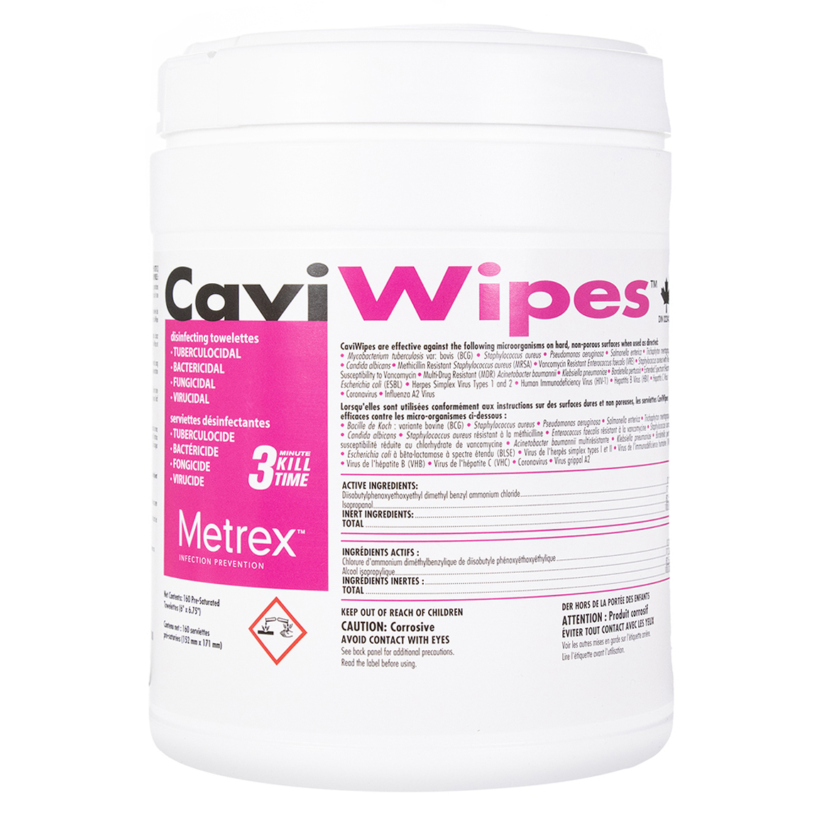 CaviWipes is a wipe pre-saturated with Cavicide surface disinfectant. CaviWipes are durable, nonwoven, nonabrasive towelettes that offer fast, easy use, time saver convenience. Recommended for use on non-porous surfaces and fixtures. CaviWipes are ideal for operating rooms, surgical centers, neonatal units, medical and dental operatories and other critical-care areas. - For use on hard non-porous surfaces - Durable, nonwoven towels won’t bunch up during use - Flat Packs minimize storage space, unclutter counter space, and are resealable CaviWipes 3 minute kill claims: Mycobacterium tuberculosis var: bovis (BCG) (TB) Staphylococcus aureus Pseudomonas aeruginosa Salmonella enterica Klebsiella pneumoniae Bordetella pertussis Trichophyton mentagrophytes Candida albicans Multi-Drug Resistant (MDR) Acinetobacter baumannii Extended Spectrum ß–lactamase Escherichia coli (ESBL) Methicillin Resistant Staphylococcus aureus (MRSA) Vancomycin Resistant Enterococcus faecalis (VRE) Staphylococcus aureus with reduced susceptibility to vancomycin Hepatitis C Virus (HCV) Herpes Simplex Virus Types 1 and 2 Human Immunodeficiency Virus (HIV-1) Human Coronavirus (not associated with Severe Acute Respiratory Syndrome or SARS) Influenza A2 Virus